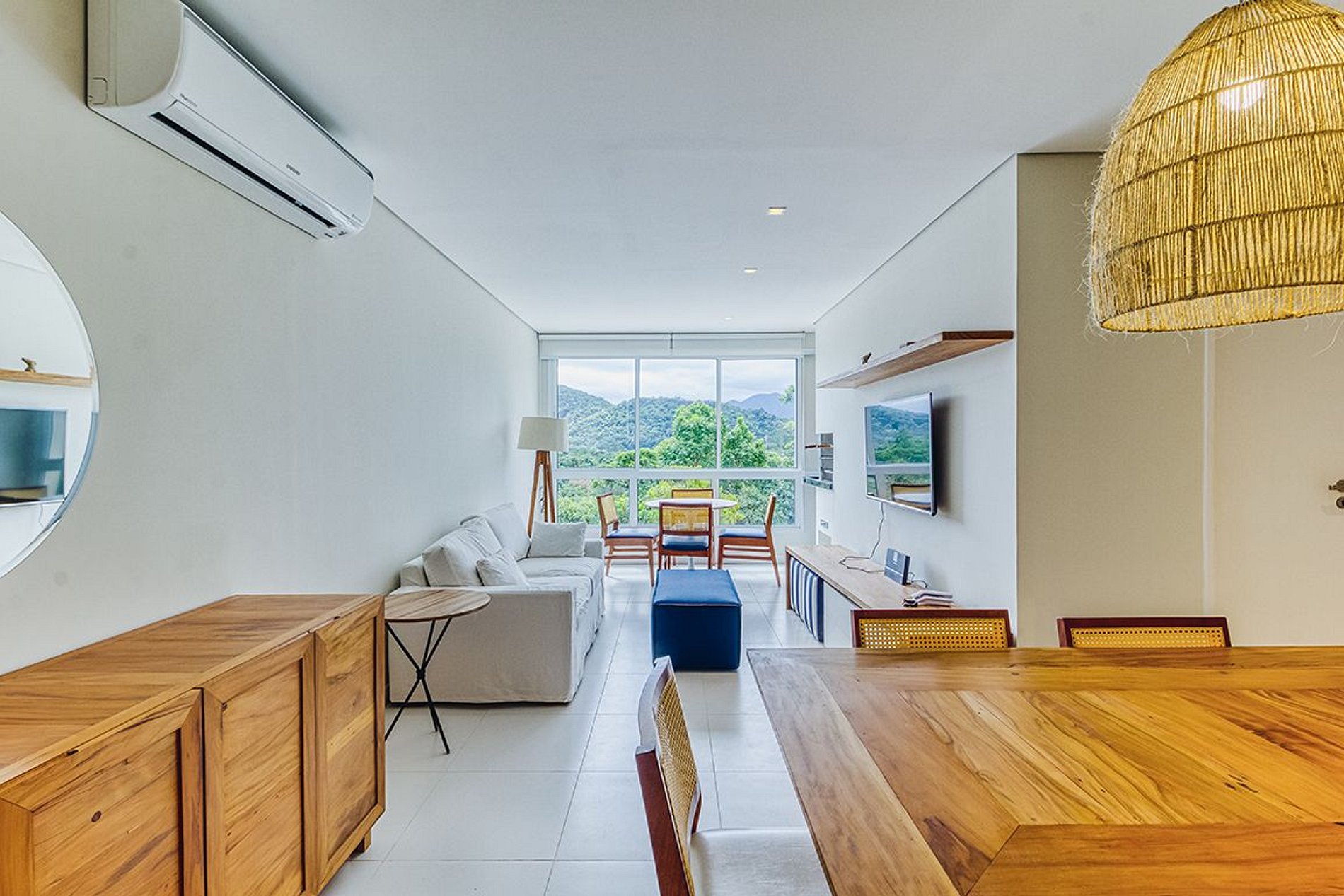 Sala estar, sala de jantar com ar condicionado, TV Smart com acesso a internet, varanda integrada a sala de estar com churrasqueira, cozinha equipada com fogão, geladeira, micro-ondas e demais utensílios, duas vagas de garagem.